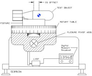 Ölçüm Prensibi: Bu basitleştirilmiş çizim temel çalışma teorisini göstermektedir. Döner tabla, hassas iğ yatağına monte edilmiştir. Çapraz ağ bükülmeleri sürtünmesiz yatay pivot ekseni sağlar. Bu pivot ekseni ile uyumlu bir burulma çubuğu, bu eksen etrafında doğrusal bir burulma yayı oluşturur. Test parçasının CG'si ölçüm ekseninden kaydırıldığında, bir dengesizlik momenti oluşturulur ve bu, moment kolunun sonuna monte edilen LVDT'nin yer değiştirmesine yol açar. Test parçasını döner tabla üzerinde 180 derece döndürmek yanlış seviyeleme, okumada sıfır sapma veya döner tabla ekseninin mil ekseninden yer değiştirmesi gibi sistematik hataları ortadan kaldırır. Parçanın ağırlığı, ağ bükülme pivotu tarafından desteklendiğinden ve LVDT tarafından sadece dengesizlik momenti algılandığından, yüksek hassasiyet mümkündür. LVDT'nin çıkışı, titreşim ve diğer yüksek frekanslı bileşenleri ortadan kaldıran moment okumasında dijital olarak filtrelenir. CG ofsetini ölçmek için, operatör tabloyu 0o değerine döndürür ve dengesizlik momenti değerini kaydeder. Daha sonra masayı 180o'ye döndürür ve ikinci bir anı kaydeder. CG, iki moment okumasını çıkararak ve test parçası ağırlığına bölerek hesaplanır.